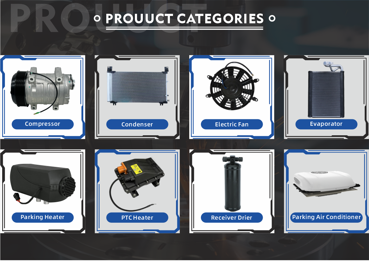 Productos principales:Aire acondicionado de camión, compresor de CA automático, condensador de CA automático, Cltuch magnético, calentador de estacionamiento